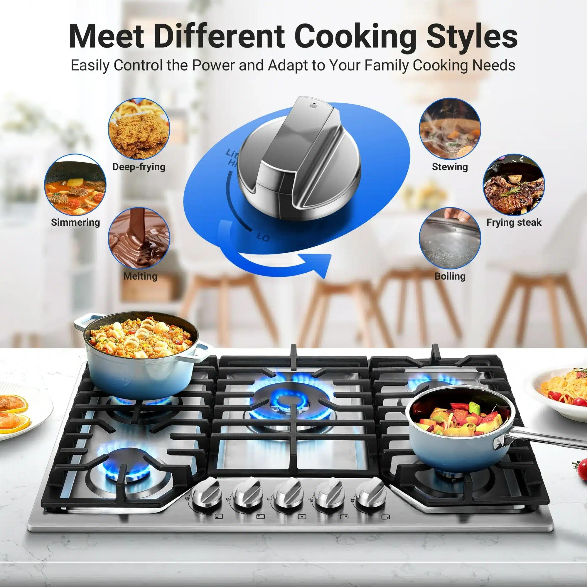 - Efficient Ignition: Features a 110V AC pulse ignition system with automatic ignition via rotating control for convenience.