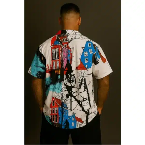 Imo, NigeriaMen’s Oversized Vintage Shirt – Artistic Bicycle & City Print – Velmora Prime
