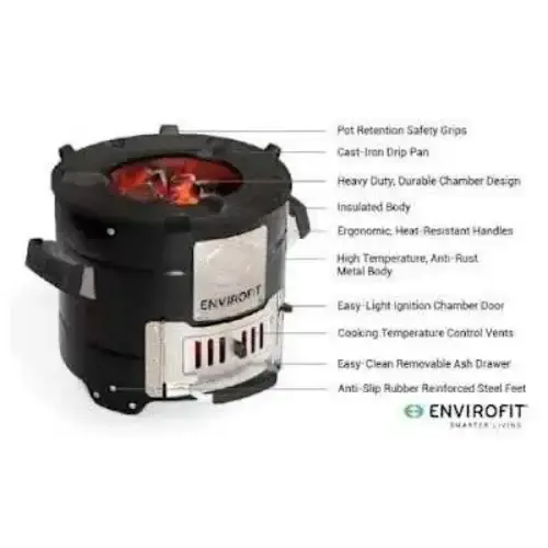The Envirofit is a charcoal stove designed to reduces fuel consumption by more than 50% and reduces harmful emissions by more than 60% compared to traditional cooking methods. the Envirofit stove cooks twice as fast with half the charcoal. Our advanced design uses a high-efficiency combustion chamber, light-weight ceramic insulation, and cool-touch handles to create a faster cooking, cleaner burning, safer and more economical jiko.