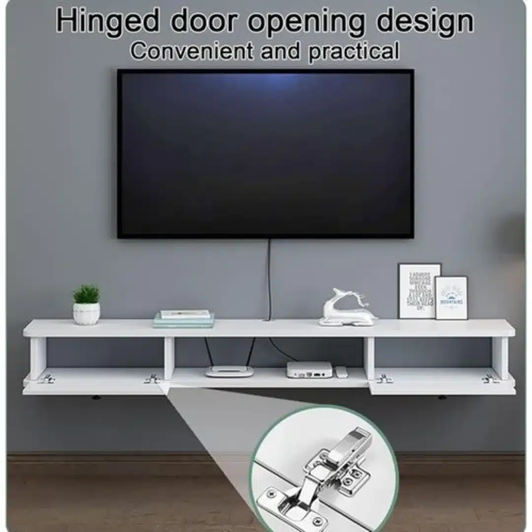 A Floating Drawer Shelf with Cabinet – TV Wall Shelf is a modern, wall-mounted unit designed to hold your TV while offering sleek storage. It features built-in drawers and cabinets for organizing media accessories, with a minimalist floating design that saves floor space and adds a stylish touch to any room.