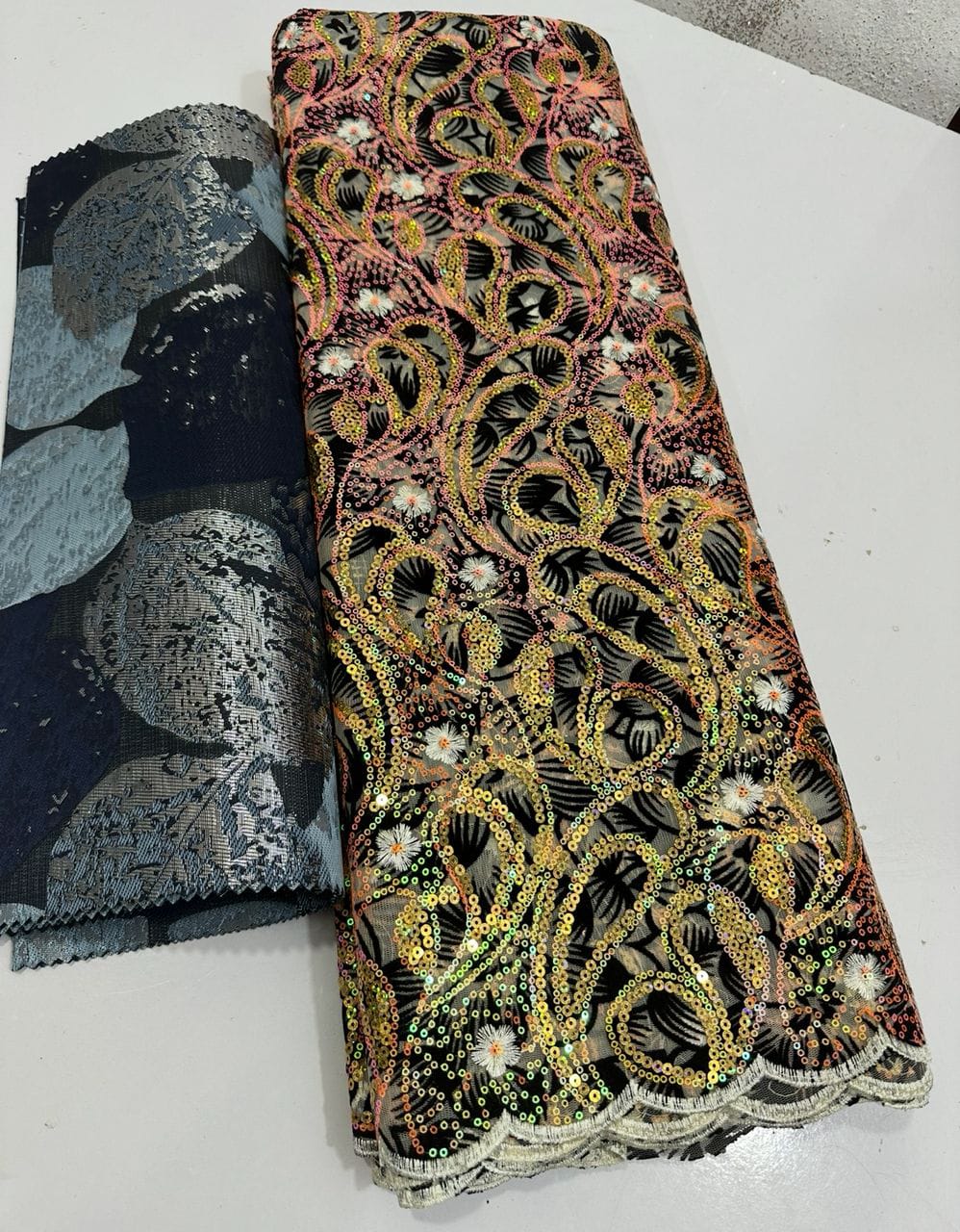 A luxurious gold and black sequin lace with ornate floral motifs, scalloped edges, and dazzling shimmer.