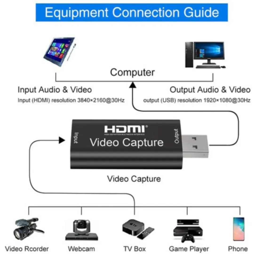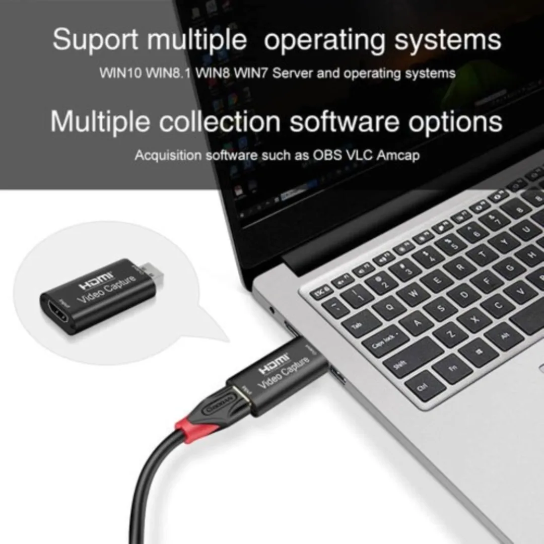 HDMI to USB Video Capture Adapter allows you to record or stream video from HDMI sources (like cameras, consoles, or laptops) directly to your computer via USB. It supports high‑definition input, plug‑and‑play setup, and is ideal for live streaming, video conferencing, and content creation.
