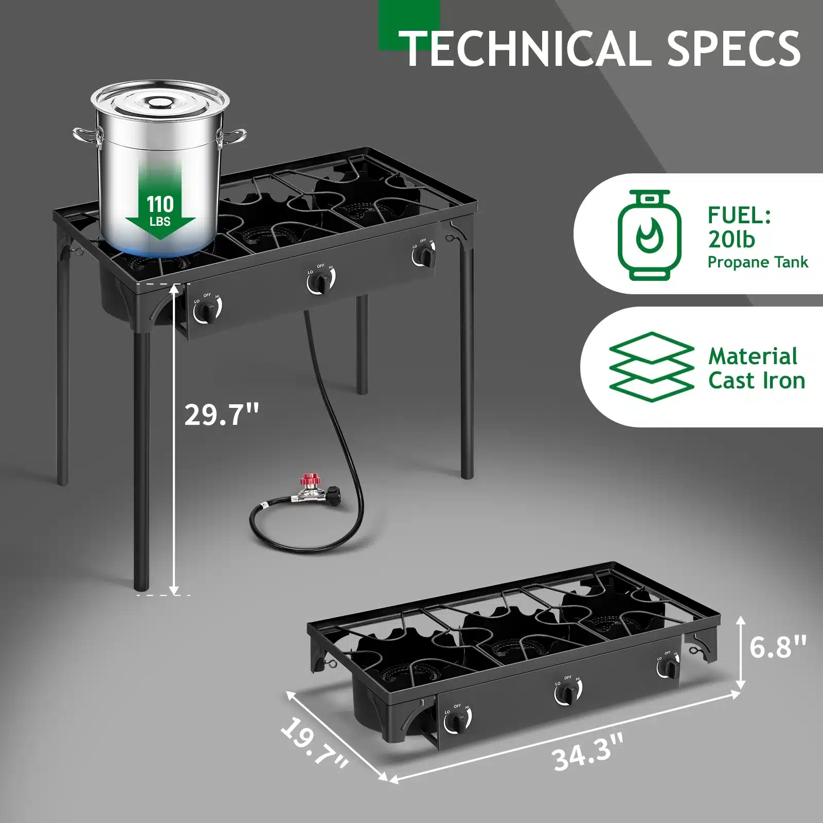 225,000 BTU OUTPUT–Supplied with three separate burner, (75,000 BTU for each) you can cook much food in the same. All burner has individual knob to control heat. Ideal to make family meals like frying fish/chicken, steaming crabs, wok cooking.