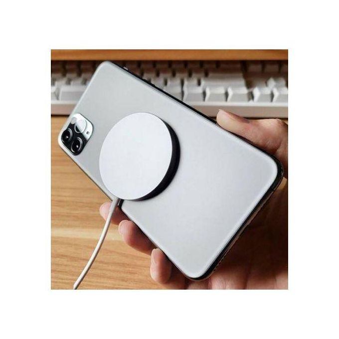 A sleek, pocket‑sized puck-style wireless charger featuring a magnetic MagSafe-style alignment ring. It delivers up to 15 W fast charging for iPhones (12–16 series) and Qi2-compatible Android phones, including Samsung devices when used with a MagSafe‑compatible case or magnetic ring