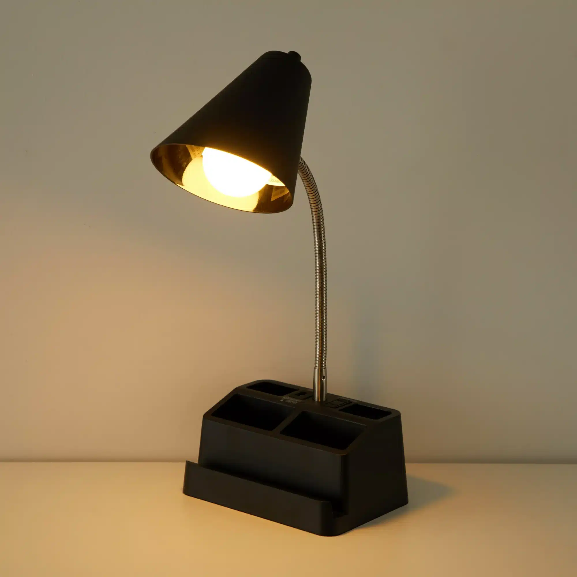 A compact and functional desk lamp designed to brighten your workspace while keeping it organized. It features a matte black finish, a cone‑style shade, and a built‑in organizer base with compartments for pens, stationery, and small accessories. The integrated USB port and AC outlet let you conveniently charge your devices as you work, making it a perfect addition to study desks, home offices, and dorm rooms.