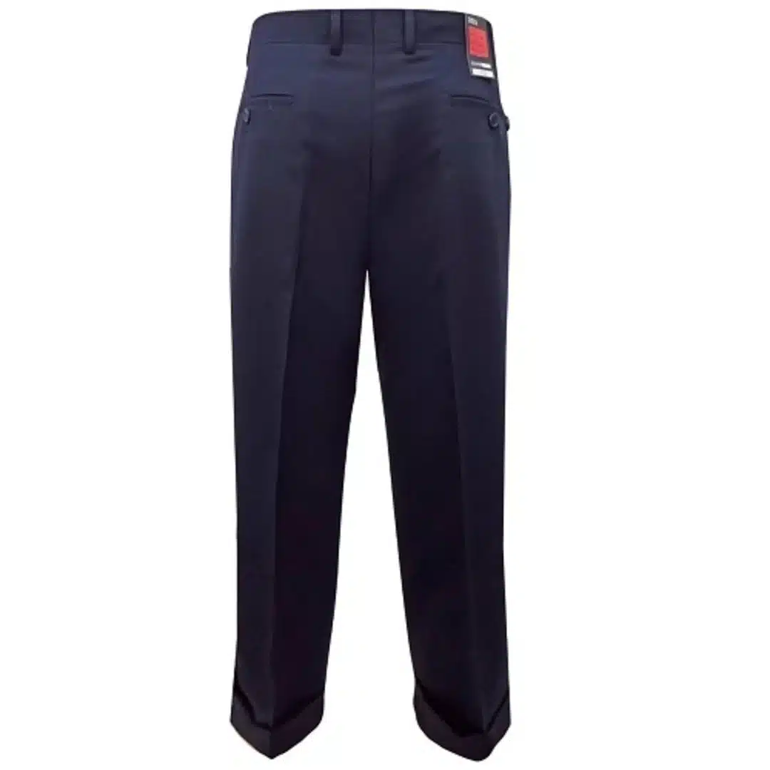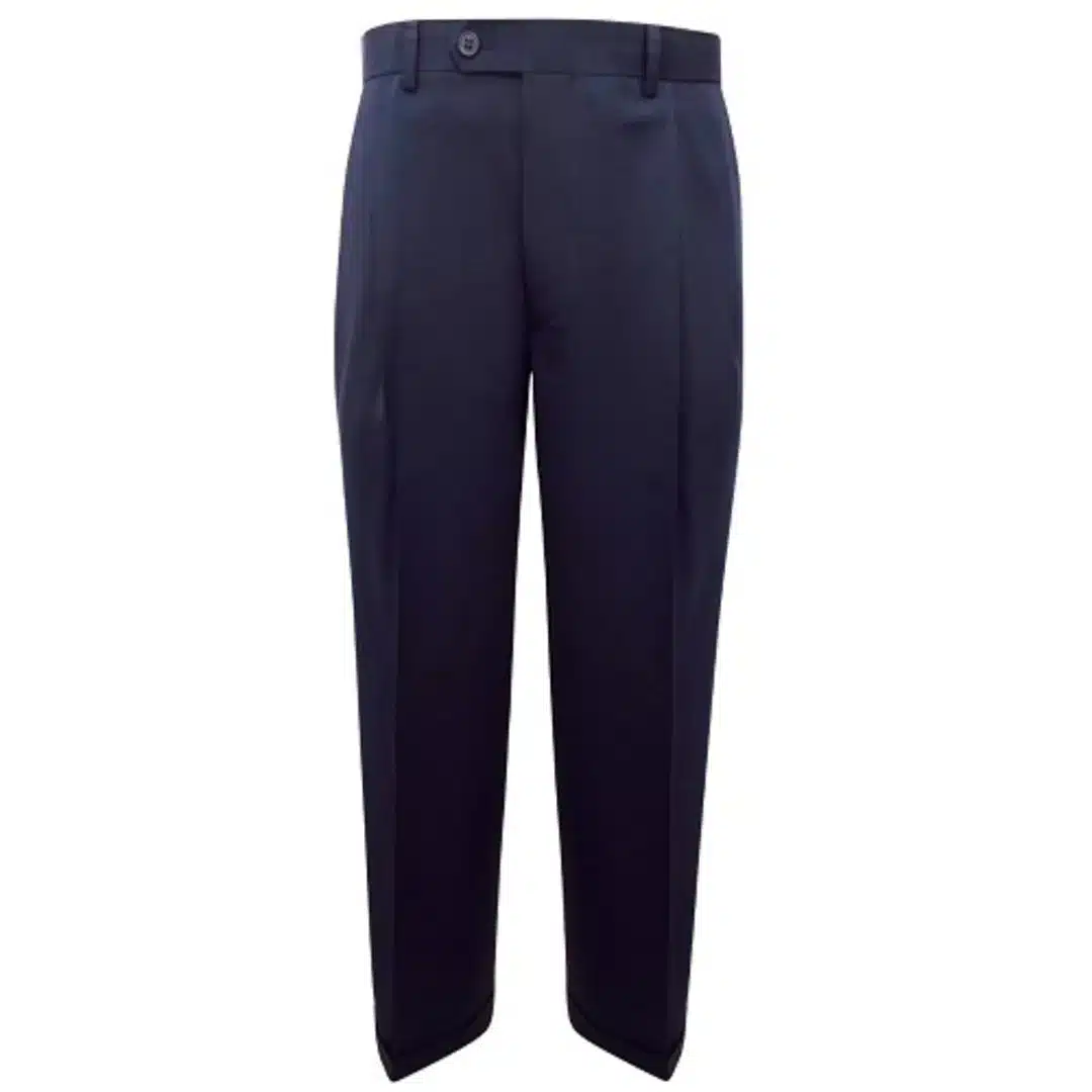 Mens plain navy tailored trousers sit on the waist with belt loops and a button and zip fastening. Twin pockets and two buttoned pockets at the rear. Turn-up hems. Material: 96% Wool – 4% Elastane (Polyester Lining) Care: Machine Wash Condition: Brand New w/Label
