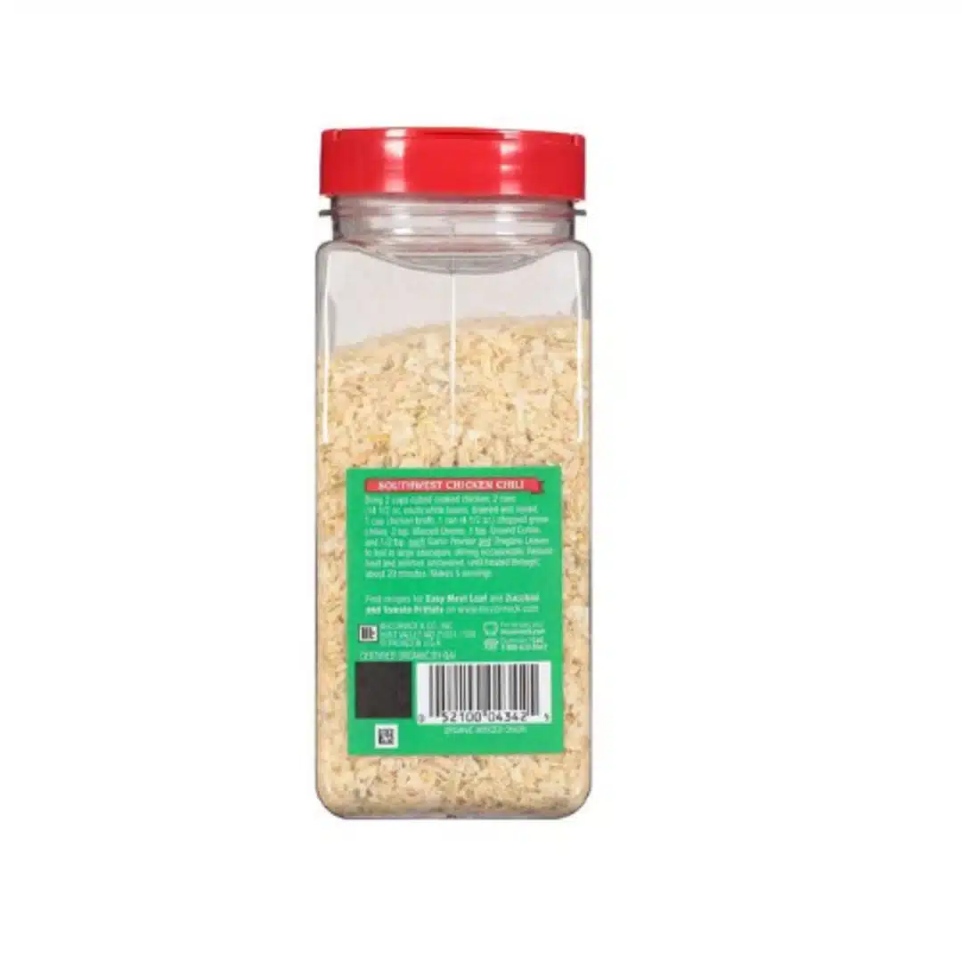 Sharp and sweet, McCormick USDA Certified Organic and Non-GMO Project Verified minced onion begins as whole white onions harvested at peak. They’re then peeled and carefully dehydrated to preserve their hearty flavor for use in recipes for meat, poultry, fish, potatoes and more. There’s no need to shed a tear when you have our no-clump, finely chopped dried onions in the spice cupboard. They can be used in any recipe that calls for fresh. If the recipe is brothy, say a soup or a stew, throw the dried onion into the pot when you add the liquid. It’ll rehydrate perfectly as it simmers. The larger bottle size is easy to handle, and great for refilling spice jars, or can be stored in the pantry as is.