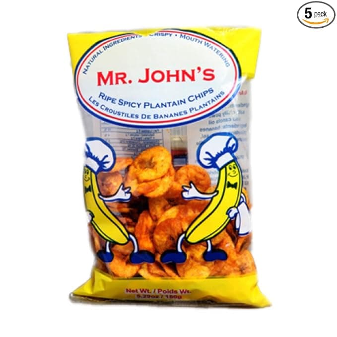 América del Norte #1. Patatas fritas de plátano favoritas. – 5 paquetes de chips de plátano picante MR. JOHN’S maduro. (5.29 oz cada paquete) – Chewy Delicious Maduro Sweet Chips