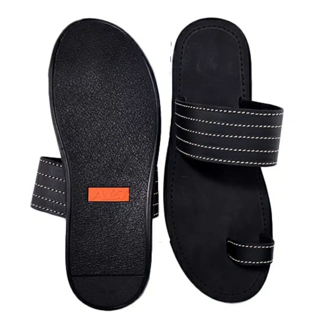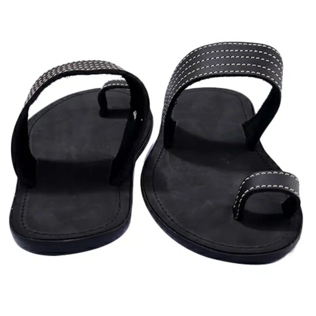 A sleek and comfortable slip-on made with genuine black leather and a handcrafted sole. Designed for casual and semi-formal wear, it features an open-toe design with a silver chain accent, offering both style and breathability. Ideal for everyday use or pairing with native attire.