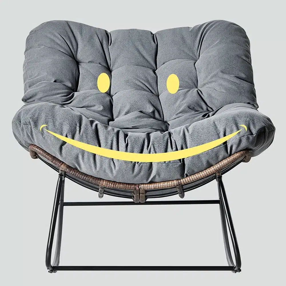 An oversized Papasan wicker rocking chair featuring a sturdy woven frame and a plush, tufted cushion. Designed for comfort and gentle rocking, it adds a cozy, stylish touch to any living space, patio, or reading nook.