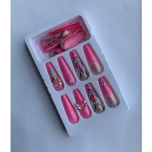 24-piece Shimmery Pink Stoned press-on nails featuring a soft pink base with sparkling stone accents. Easy to apply, reusable, and perfect for elegant, eye-catching manicures.