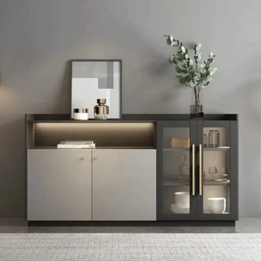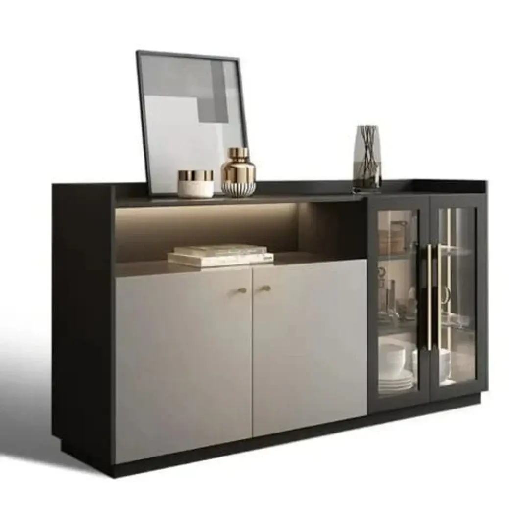 Contemporary storage unit featuring built-in LED lighting—adds ambiance and functionality to dining or living spaces.