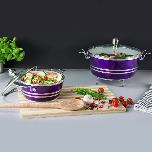 The SQ Professional Metallic Die-Cast Stockpot Set — 5 stainless steel Amethyst‑colored pots made from durable die‑cast aluminum. These heat-efficient stockpots feature ergonomic handles and elegant metallic finish, perfect for stylish and high-performance cooking in any kitchen.