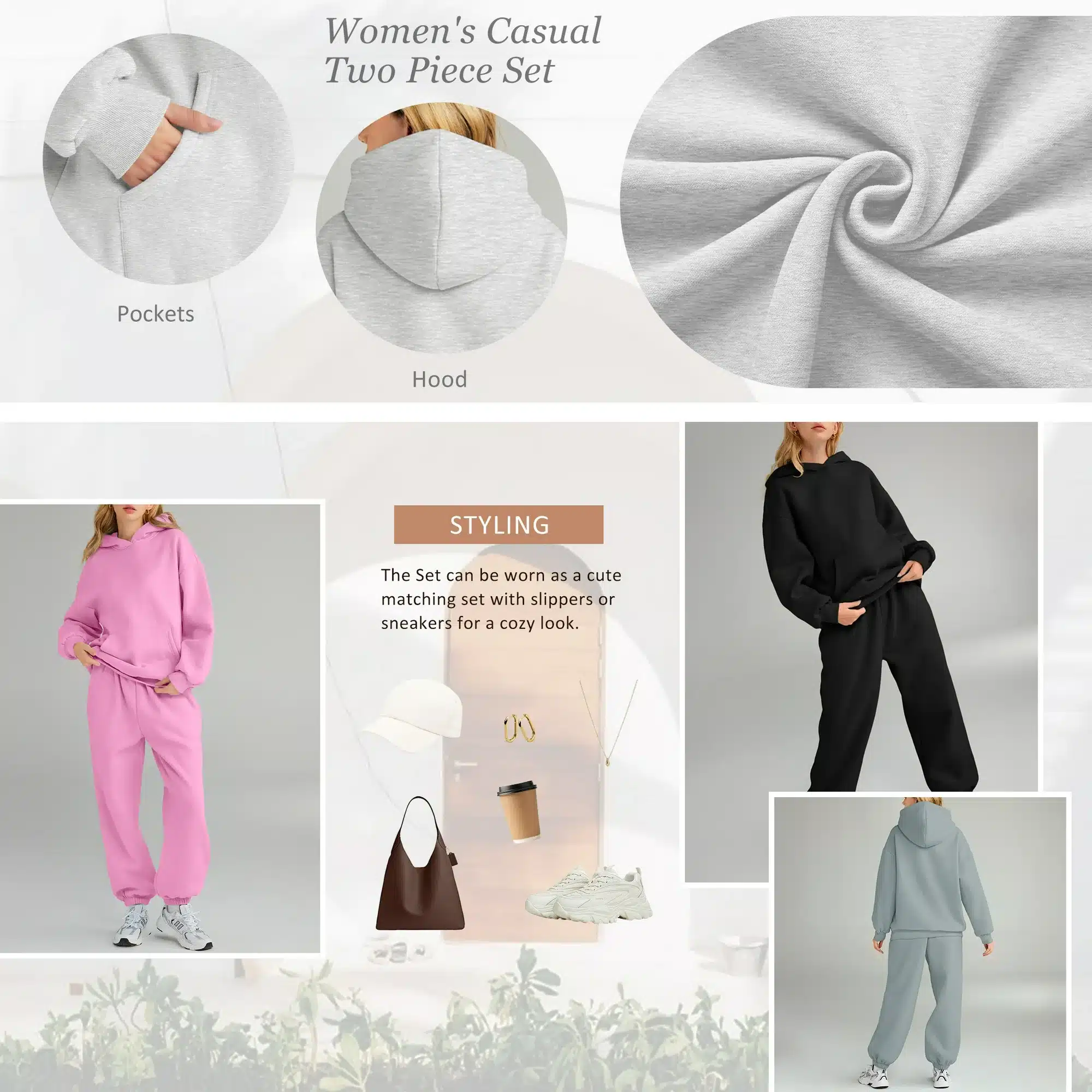 - Versatile Features: Includes an oversized long sleeve hoodie with kangaroo pocket and high waist sweatpants with elastic waistband and drawstring.
