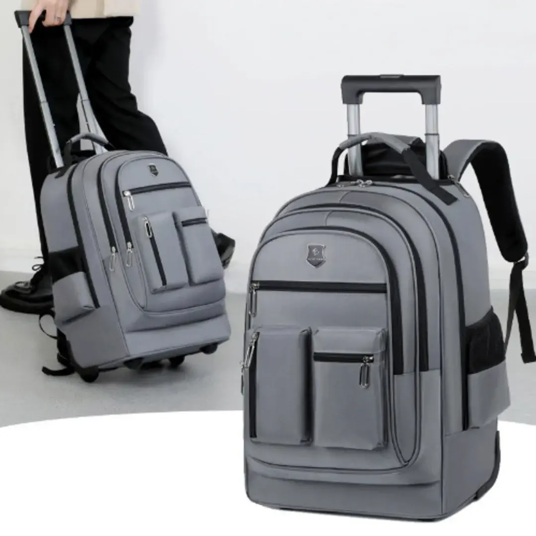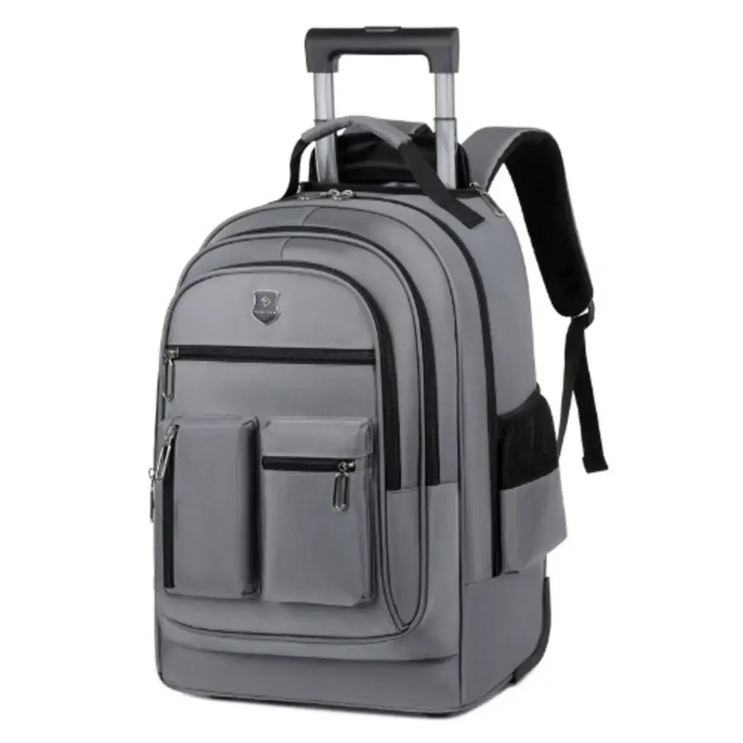 Versatile and travel-ready, this grey trolley backpack features a spacious main compartment, smooth-rolling wheels, and adjustable shoulder straps. Ideal for school, work, or weekend getaways.