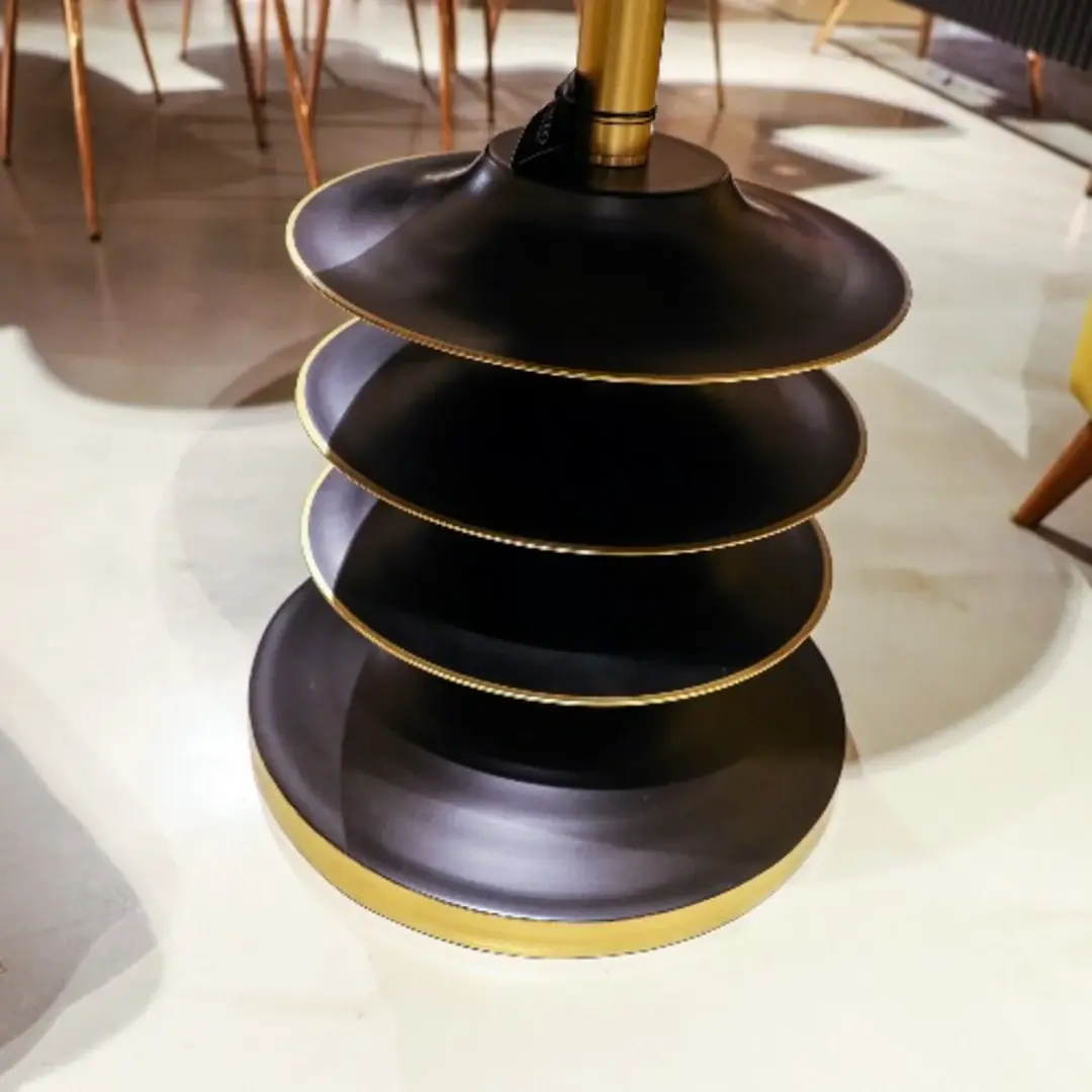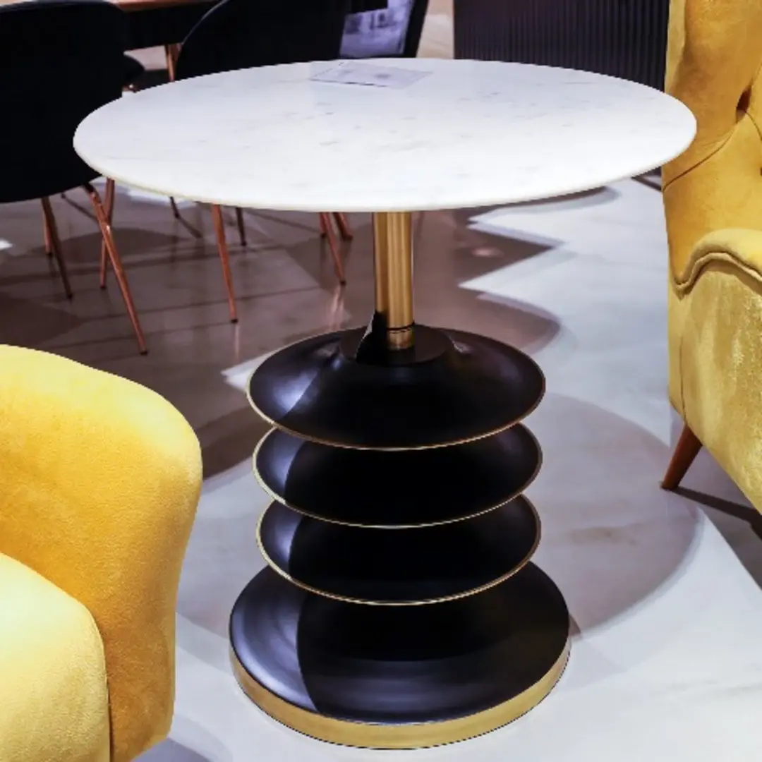 Adding contrast underneath is a striking, concentric tower base constructed of black and gold metal. The 15 cm diameter base stands proudly while balancing the elegant marble top. Its architectural design makes a bold statement that complements the timeless marble.