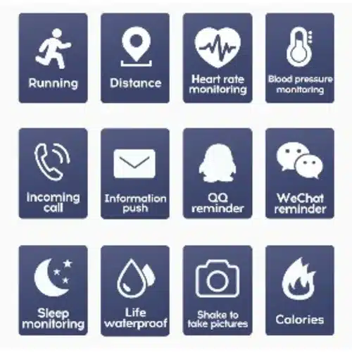 - Functions: Alarm Clock, Blood Oxygen, Date, Measurement of heart rate, Messages, Sedentary reminder, Sleep management, Time.