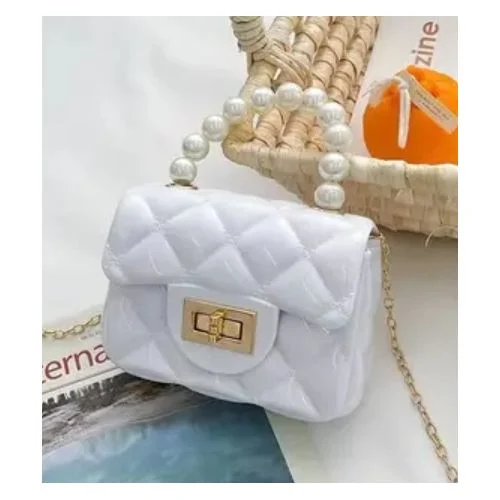 A stylish and compact handbag made from glossy, waterproof PVC. Features a pearl-accented handle and gold-tone chain strap, perfect for both handheld or crossbody wear. Ideal for carrying essentials with elegance and ease.