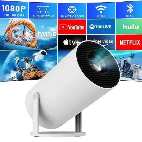 Compact Mini Projector—portable and bright LED projector ideal for home cinema, presentations, and outdoor movie nights. Offers crisp image quality, multiple input options (HDMI/USB), built-in speaker, and long lamp life for versatile entertainment or business use.