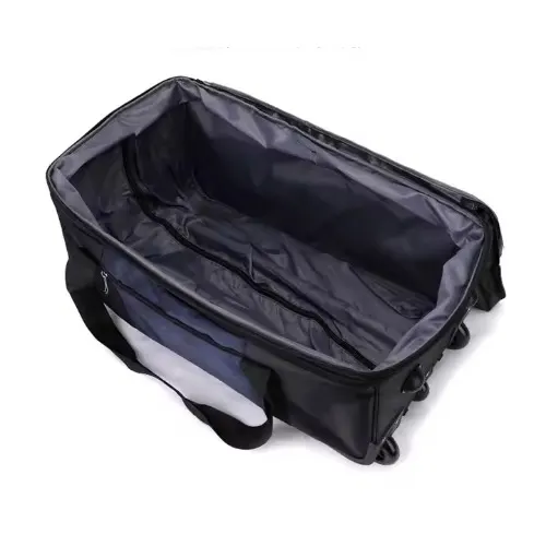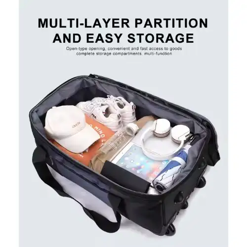 This black duffle bag is ideal for business trips and travel, offering a spacious interior to hold clothes, shoes, and essentials. Made from durable leather polyester, it features rolling wheels, a comfortable handle, and a secure zipper lock. Lightweight yet roomy, it’s a stylish and practical choice for versatile travel needs.