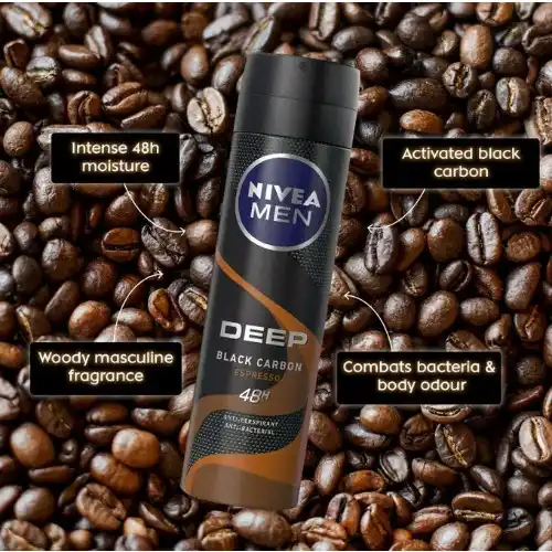 NIVEA MEN Deep Espresso Anti-perspirant protects the skin from sweat and germs for a long-lasting dryness and clean skin feel just like after a shower. The effective formula with Black Carbon acts powerfully against germs and is complemented by a modern, masculine and sensual scent; Espresso. It also doesn’t leave any visible black residue behind. Discover this new tempting and addictive fragrance blending fresh pineapple and espresso ristretto with a touch of spices and dark chocolate. Unleash your senses diving into this world of sweet seduction.