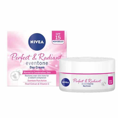 NIVEA Perfect & Radiant Even Tone Day Cream SPF 15 enriched with Event one Pure Active, Vitamin E and SPF 15 works to gradually enhance skin complexion and visibly reduce the appearance of dark marks, while protecting your skin from harmful effects of the sun