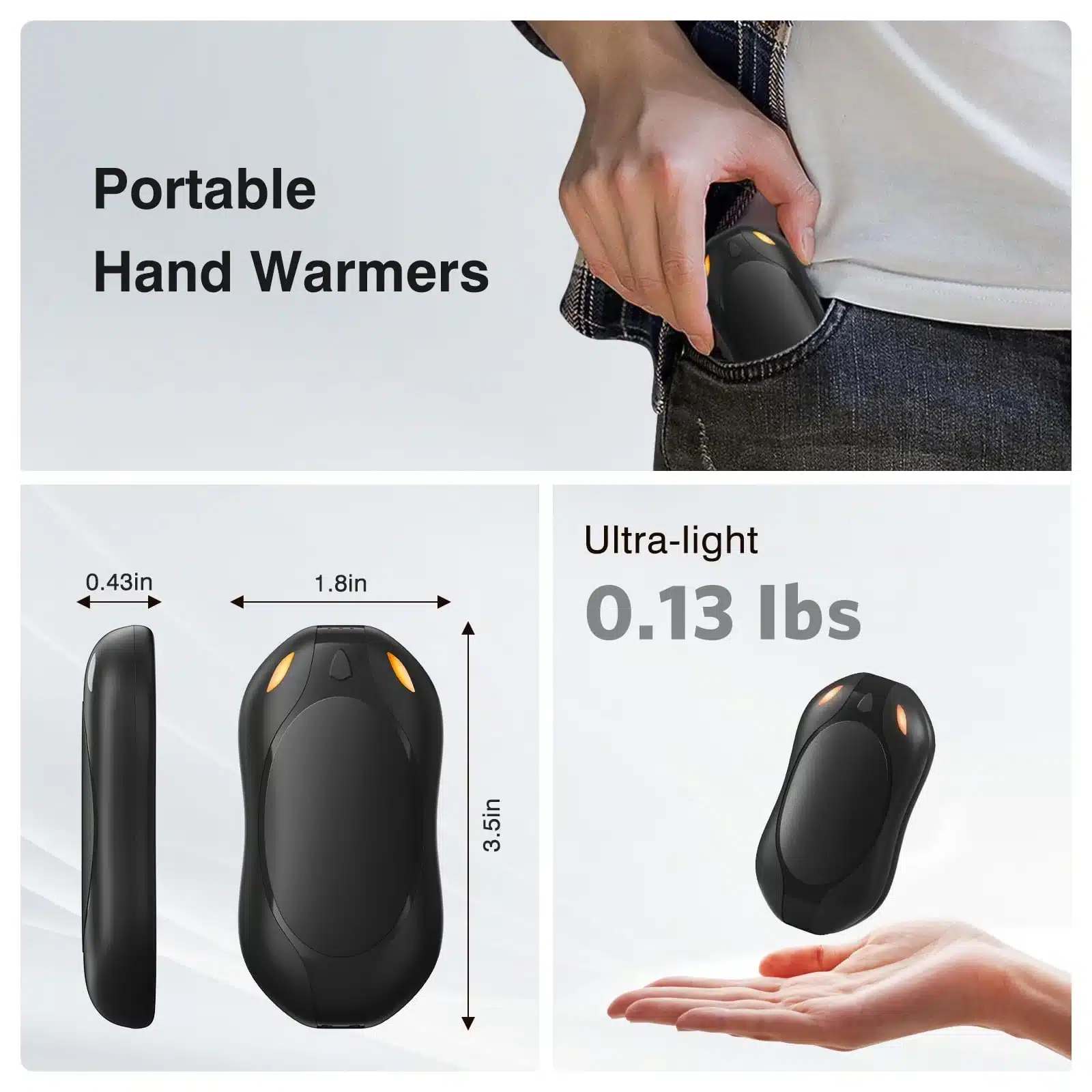 - Smaller than a smartphone (1.8”L) and lighter than an apple (0.13 lbs), slip these portable hand warmers into pockets, gloves, or purses. Ideal for commutes, ski lifts, or icy morning dog walks—warmth on demand without bulk.