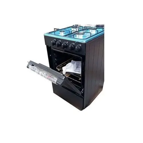 The Scanfrost Automatic 50 × 55 cm 4-Burner Gas Cooker combines four enamel-supported burners with a built-in gas oven and grill behind a double-black-glass door, plus auto-ignition, enamel pan supports & burner caps, a gas lid, and includes accessories & instruction manual.